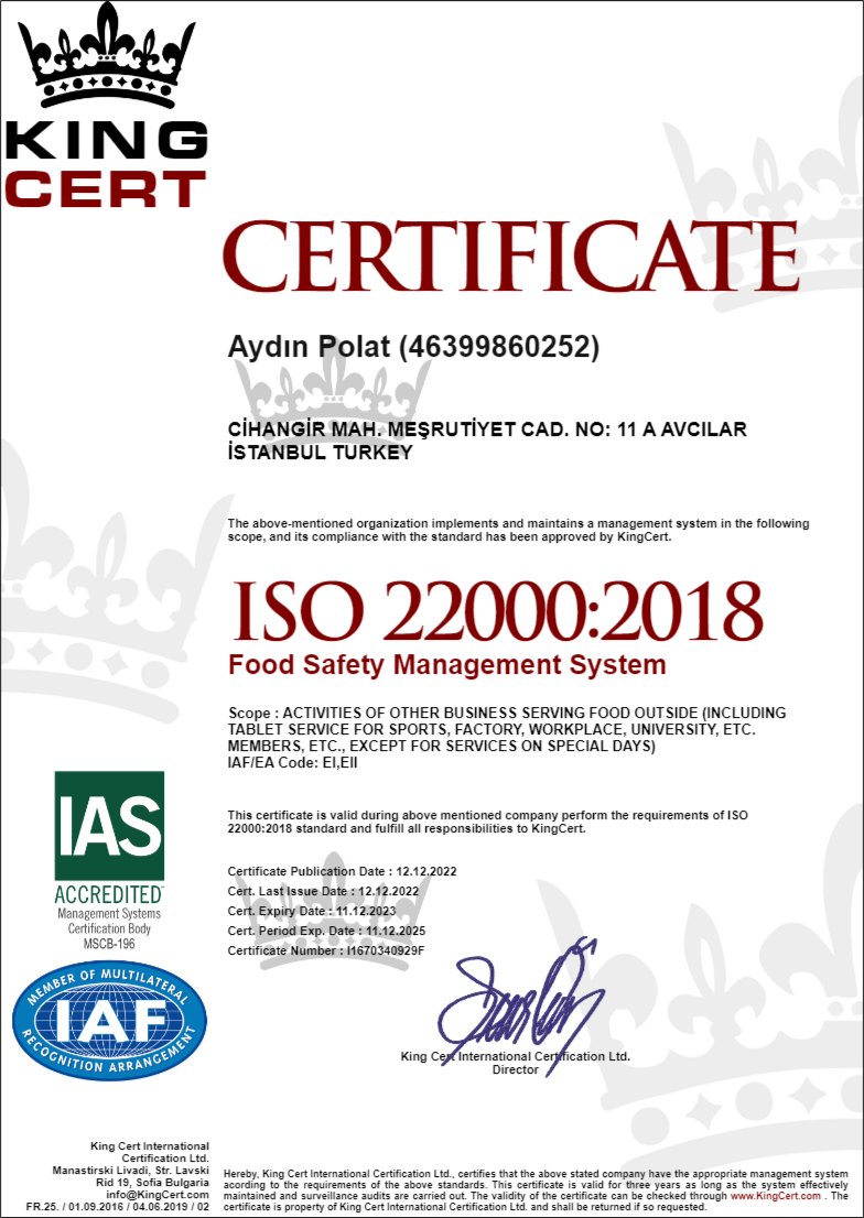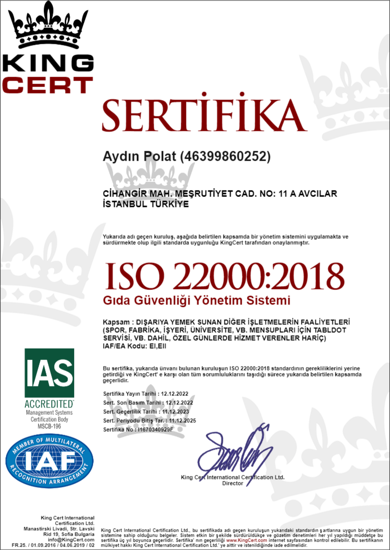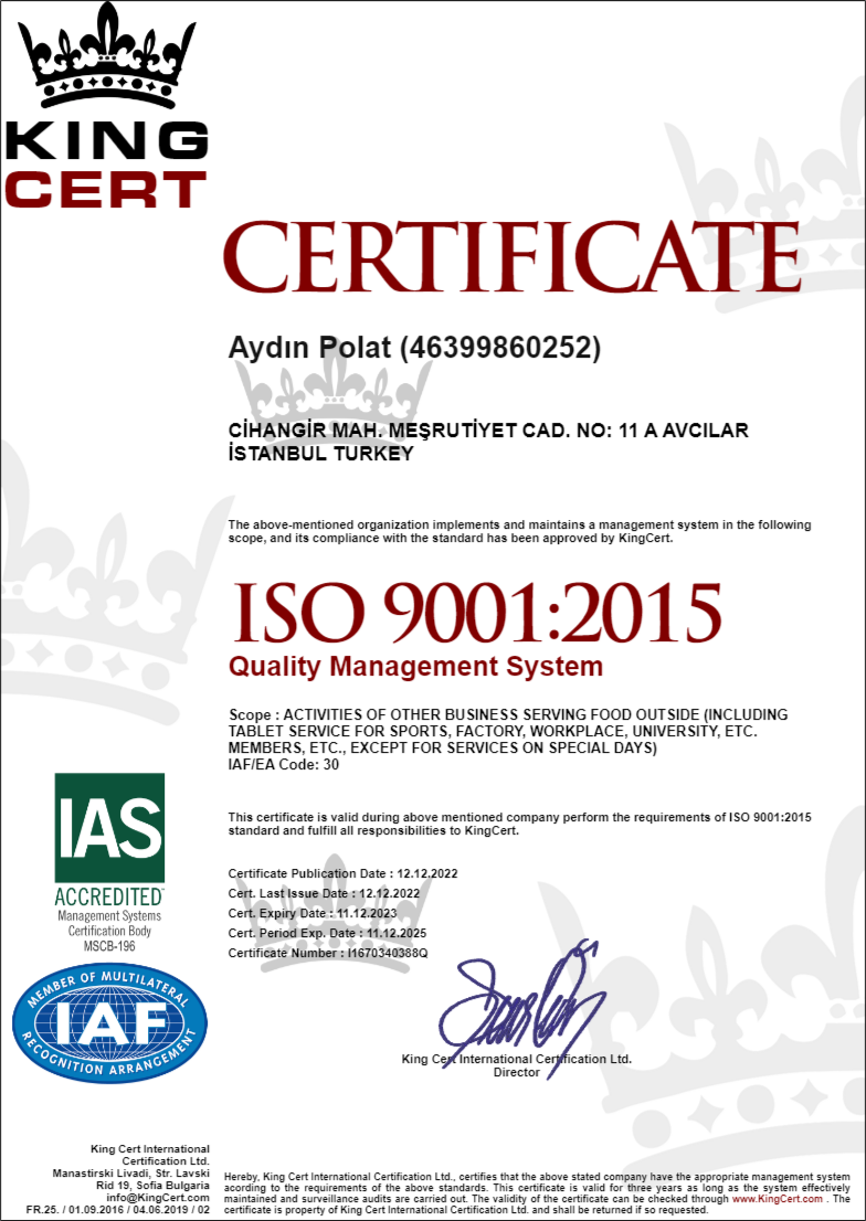 • Firmamız, TSE - ISO - HCCP standartlarına uygun olarak aşçıbaşımız yönetiminde hizmet vermektedir